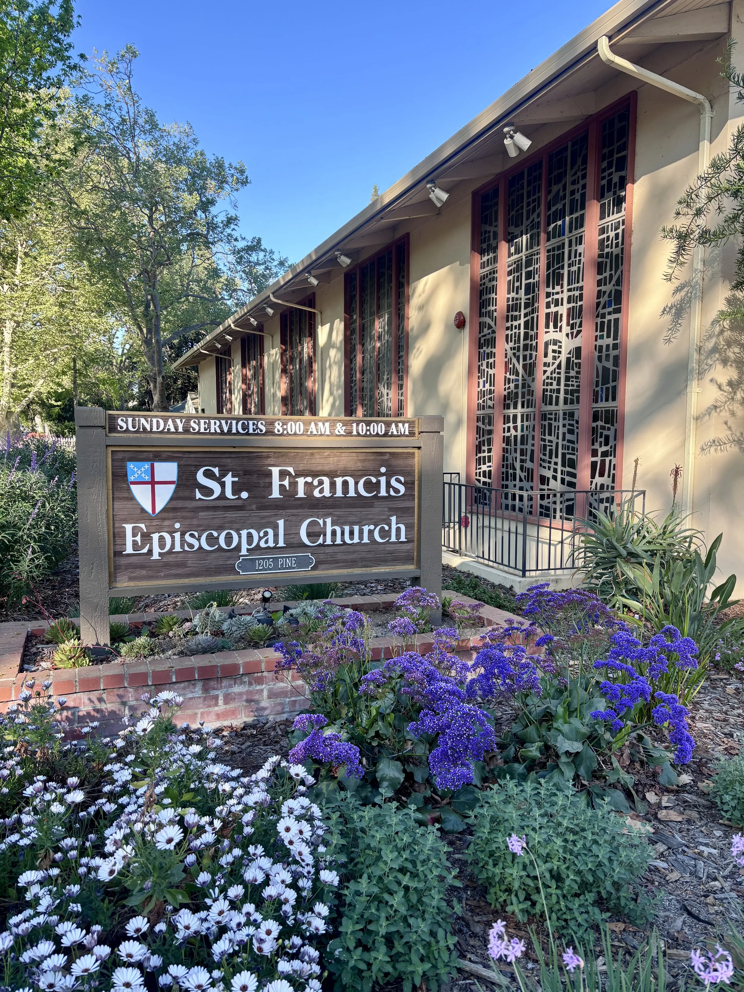 I’m always amazed by how many churches are in this little neighborhood. This one had a variety of pretty purple flowers out front.